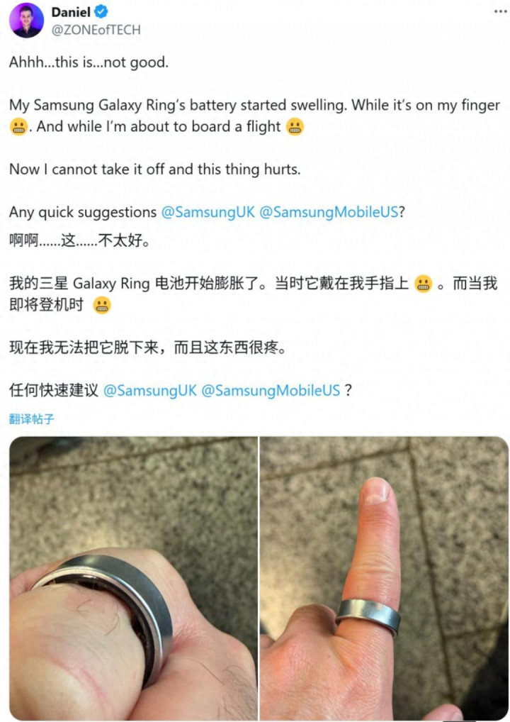 一位名为丹尼尔(Daniel)的科技博主在社交媒体平台X上分享了一段令人震惊的经历:他佩戴的三星Galaxy Ring智能戒指电池突然鼓包,导致戒指紧紧卡在手指上无法取下,最终不得不前往医院求助。