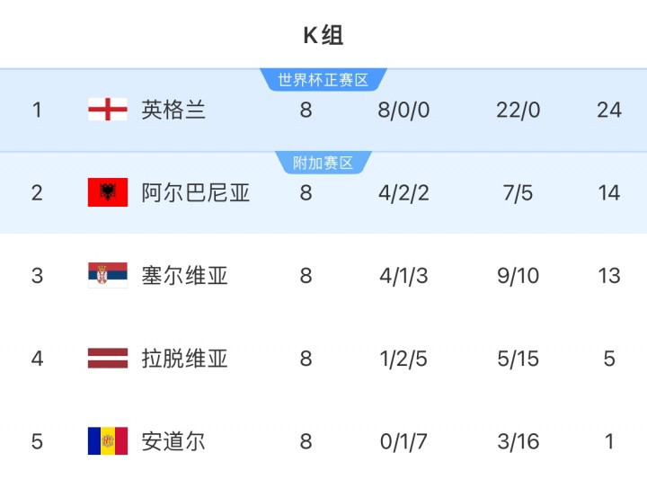 直播吧11月17日讯英格兰2-0战胜阿尔巴尼亚后,世预赛欧洲区K组8轮比赛全部结束,阿尔巴尼亚小组第二获得附加赛资格。